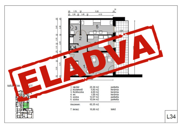 A jelen adatok tájékoztató jellegűek, ezért a Beruházó azok változásával, vagy bármely attól való eltéréssel kapcsolatban semmilyen kötelezettséget, vagy felelősséget nem vállal. Az ábrázolt berendezési tárgyak és bútorok, a burkolatok megjelenése nem képezi a szerződés tárgyát. A pontos felszereltség műszaki leírás szerint. A területek burkolatlan felületekre értendőek. A nettó területek helyiségeknek a falak közötti területei. A bruttó területek tartalmazzák a válaszfalak alatti területet. Jelen rajzon szereplő méretek a kiviteli tervek szerint módosulhatnak.